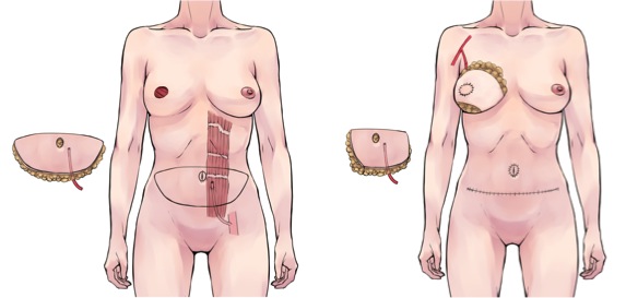 腹部の皮膚・脂肪・血管(皮弁)を一塊でとりだします。一旦皮弁を栄養している血管を大腿部で切り離し、胸へ移植し、乳房を再建します。移植時に先ほど一旦切り離した血管を胸もしくは脇の血管と顕微鏡でつなぎ直して移植した皮弁に血流を再開させ、皮弁を生着させます。これにより腹部の約半分から2/3程度の大きさの皮弁をもちいて乳房を再建することができます。片側の栄養血管ではボリュームが不足する場合は両側の栄養血管を用いて、一方の血管を対側血管へバイパスを行い(皮弁内吻合)、より多くの皮弁を乳房再建に使用できるように血流付加を追加する場合があります。