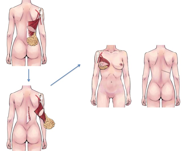 術中に体を側臥位(横向け)にし、背中から背中の筋肉(広背筋)と脂肪、皮膚を、栄養している血管をつなげたまま胸に移植する方法