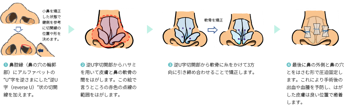当施設では鼻の成長を考えて初回の唇裂手術においては鼻への手術操作を最小限にとどめており、外鼻形成手術(鼻の形態修正手術)は小学校就学前の4-6歳ころに行います。唇裂のある患児は小鼻(鼻翼)が外側に広がりひしゃげて(扁平化)おり鼻の穴(鼻孔)がせまくなっている(狭小化)ことが多いです。方法は当科(大阪医科薬科大学形成外科)を開設した初代教授である田嶋定夫先生が考えだしたReverse U切開法(逆U字切開法)を用いております。唇裂における鼻の変形の原因の一つは軟骨の位置異常です。先にも述べましたように唇裂の初回手術で鼻の形態を維持する筋肉は必要最小限で矯正されていますが、鼻の軟骨と皮膚の位置関係はズレた状態のまま残っています。この手術の目的は軟骨をできるだけ正しい位置に戻すことです。約10日間の入院となります。退院後は後戻り変形予防に鼻孔の固定器具(リテイナー)の装着を約3か月間行います。