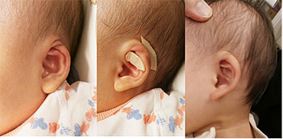 新生児期であればテープによる矯正が可能なことがありますが(図3)、戻る力が強い場合は手術が必要になります。