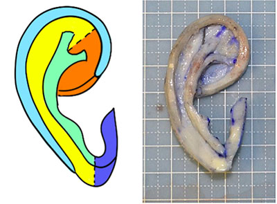 耳甲介型では外耳道が空いている場合があり、手術では下半分の耳を生かして耳を形成します。耳垂型では小耳症の一部を耳垂(みみたぶ)として手術で形成する耳に用いますが、ほとんどの形態を新たに手術で形成します。