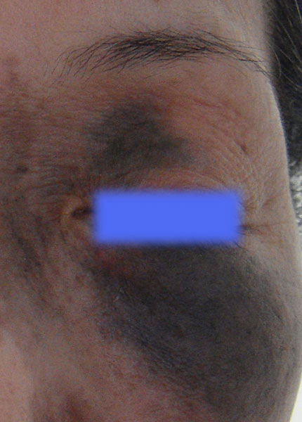 茶あざ、青あざは皮下に異常なメラニン色素が増殖し皮膚を通じて透けて見える状態です。生まれつき、もしくは若い頃に出来る目の周りのアザ(太田母斑)、おしり以外の場所にある蒙古斑(異所性蒙古斑)や、けがのあとにできるシミ(外傷性色素沈着)に効果があります。レーザー光を照射しますと、レーザー光はメラニン色素に吸収され、メラニンが破壊されるため色が薄くなります。照射後は、1週間くらいで茶色のかさぶた状になることがあります。無理にはがさないようにし、軟膏を塗って自然と脱落するのを待ちます。照射部位の膨隆や、点状出血を認めることもあります。照射後に再生してきた皮膚は薄いので半年くらいはピンク色の色調ですが徐々に肌色になっていきます。