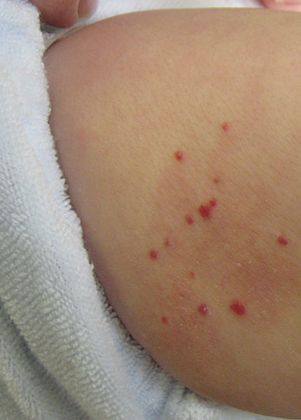 赤あざは、皮下に異常な血管が増殖し、赤血球のヘモグロビンの赤い色が皮膚を通じて透けて見える状態です。レーザー光を照射すると、レーザー光は赤血球の中のヘモグロビンに選択的に吸収され、ヘモグロビンが破壊されるのと同時に赤血球や血管壁も破壊されるため、赤い色が薄くなります。約3か月の間隔をあけて複数回の治療が必要です。10回以上治療が必要な場合もあります。乳児血管腫(いちご状血管腫)に対するレーザー治療の目的は、病変の消退期に入る1才前後までの増大をできるだけ抑え、消退後の瘢痕を少なくすることです。目の周囲や耳・鼻など機能や形態に関わる部位や広範囲の場合、また潰瘍や出血を伴う場合はプロプラノロール内服治療との併用も行っております。毛細血管奇形(単純性血管腫)に対するレーザー治療の目的は見た目を改善することです。本疾患はレーザーによって完治することはなく、一生を通じて病変が目立つようになったら治療を繰り返す必要があります。色素レーザー治療直後は皮内出血により一時的に赤紫色になり目立つことがあります。また、一過性に色素沈着が起こることもあります。レーザー照射部位はサンスクリーン剤(日焼け止め)を塗るなどの遮光をして頂きます。