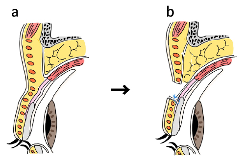 いわゆる加齢による眼瞼下垂症や、長期のコンタクトレンズ装着したことによる眼瞼下垂症のことを腱膜性眼瞼下垂症といいますが、この腱膜性眼瞼下垂症とは、眼瞼挙筋という眼を開けるために働く筋肉と、瞼板という軟骨とをつないでいるスジ(挙筋腱膜)が、伸びて薄くなってしまい外れてしまうことで生じます。手術は、この挙筋腱膜を前進させて看板に再固定します(図1 a,b)。手術は、一般的に局所麻酔下(局所注射)に行うことができます。安静が必要な基礎疾患をお持ちの方でなければ日帰りで手術が可能です。
